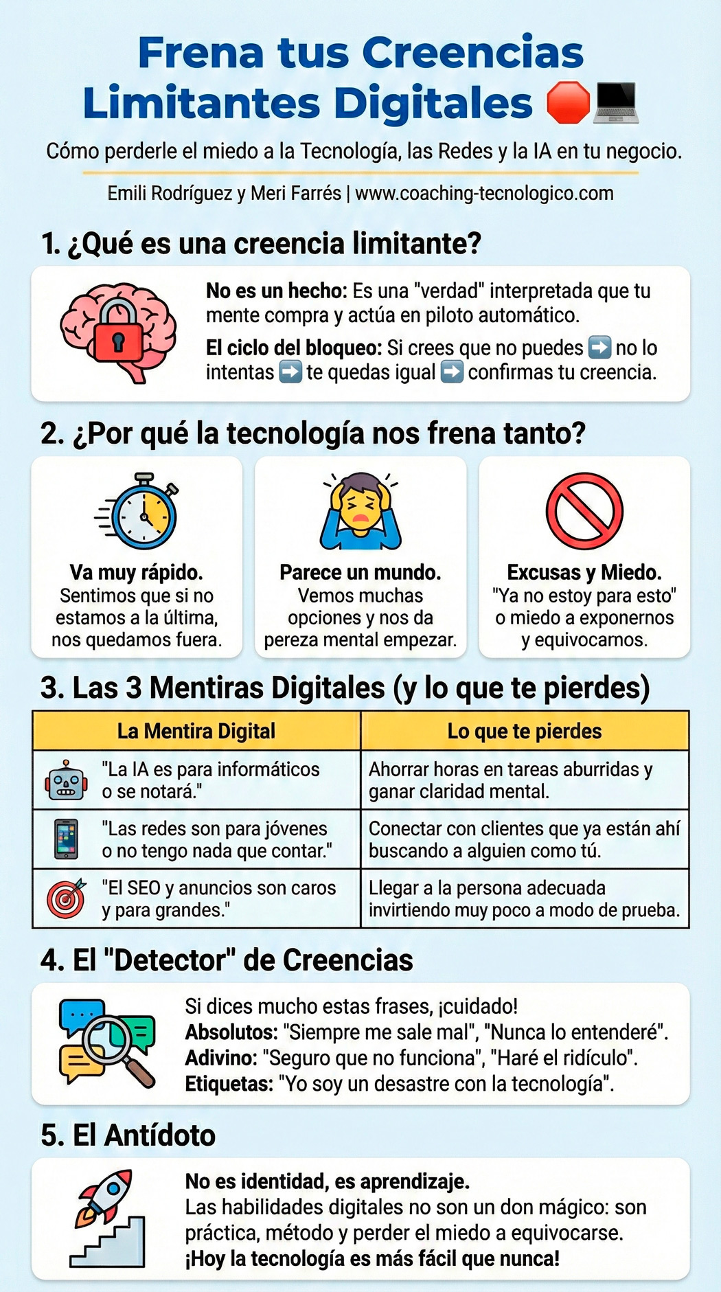 Y ahora sí: cuando entramos en tecnología y digitalización, estas creencias se suelen amplificar… porque todo va rápido, parece difícil y da más miedo equivocarse en público.